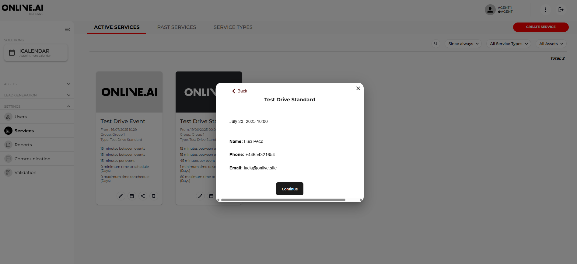 2. Select the Car Model, the date and time that the user wants from the available options. If there are more than one Agent in a group/dealership, you will need to select the calendar for the specific agent to whom the booking will be assigned.