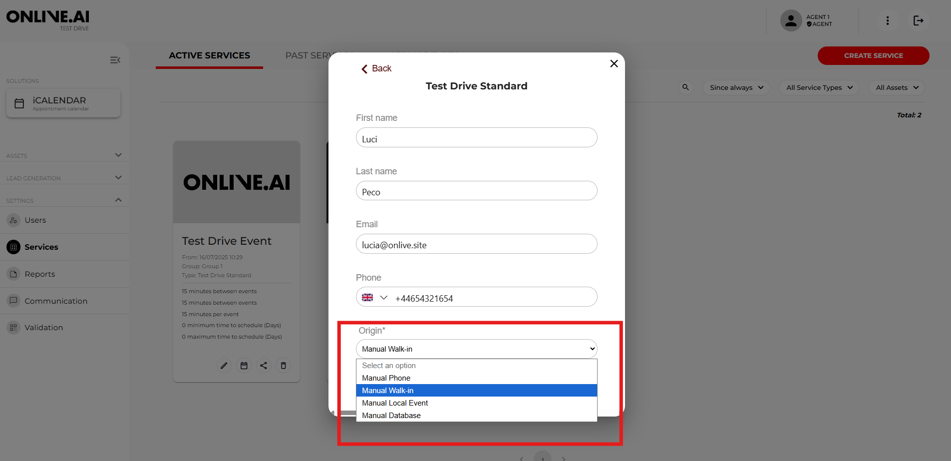 Imagine that an end user/customer walks in to a dealership and wants to take a test drive right then or at another time. In this case, the process is very similar to the previus except that “Walk-in” must be selected in the SOURCE field.