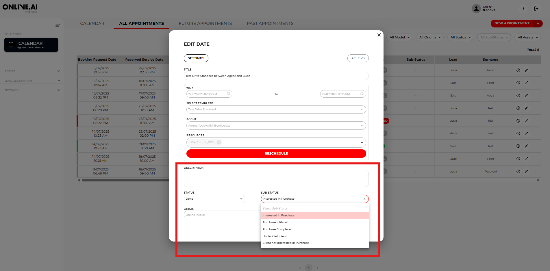 - Sub-status - Select the most appropriate option from the dropdown menu after the booking. If a sale eventually takes place after a driving test, change the sub-status to “Purchase made”.
