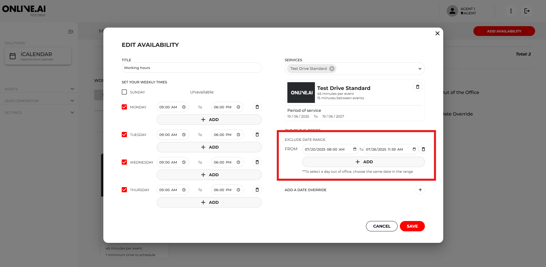 - Specify the dates when the Agent will be absent. This is especially helpful for full days of absence.
