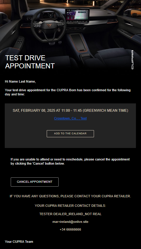 Upon booking on any of the pages, the end user and the CUPRA Master/dealer will receive an instant email with the relevant booking information (date and time, CUPRA Master/dealer details). The end user will also receive a series of reminder emails in advance of their booking date.