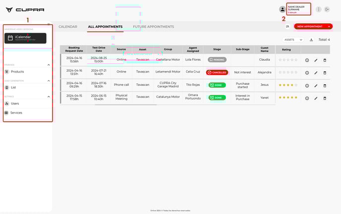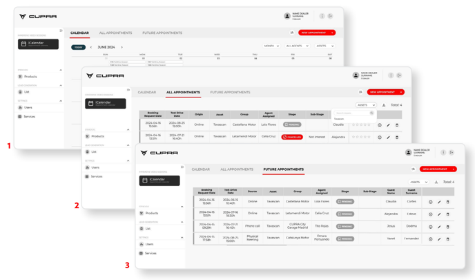 This section will show all the scheduled test drive sessions for each dealership. The CUPRA Master will have access to various tabs for different views: 1) Calendar; 2) “All appointments” tab; 3) a tab with “Future appointments”; and 4) a tab with “Past appointments”. These views provide a quick and simple overview of all the information on test drive bookings and the end users who made those bookings. This section will be explained in further detail in Chapter “3. How the iCalendar section works” of this manual.