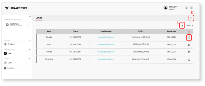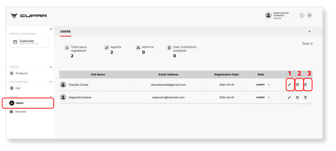 The market admin (importer) can open this section to see all the users registered in the system in their market and to which group/dealership they belong. Admin users will also be able to edit any data they need (1), view the availability of each CUPRA Master in their same group (2) or delete a user from the system (3).