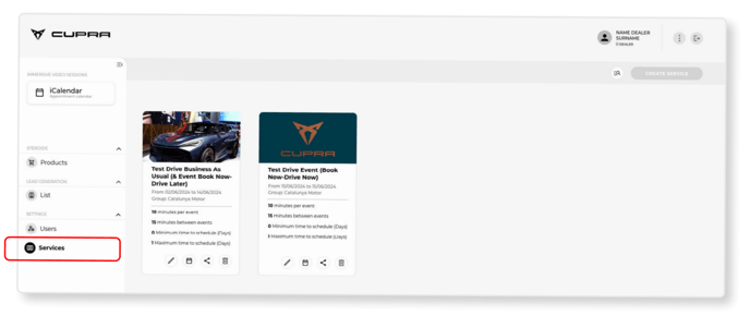 - SERVICES: A service is understood as a bookable activity involving a CUPRA Master and a vehicle with a series of configurable parameters (eg: duration of the service, dates of availability of the service, products related to the service, etc).