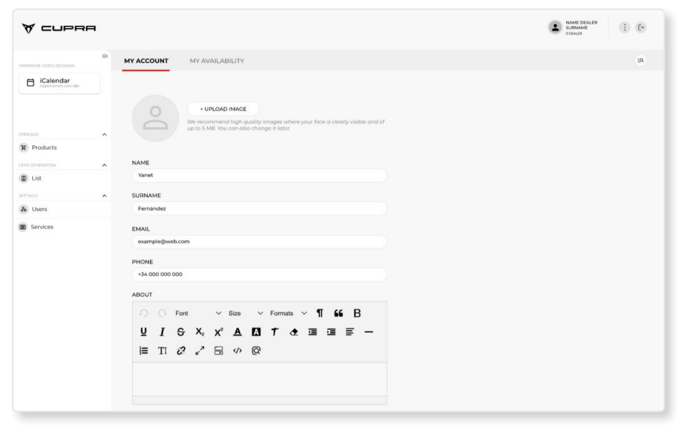 - MY ACCOUNT: The CUPRA Master will be able to add their own personal data in this section, such as name, surname, e-mail address, telephone number and any other relevant information about their role. They will also be able to add a profile image at the top, although this information will not be visible to end users within the “Instant Booking” project.
