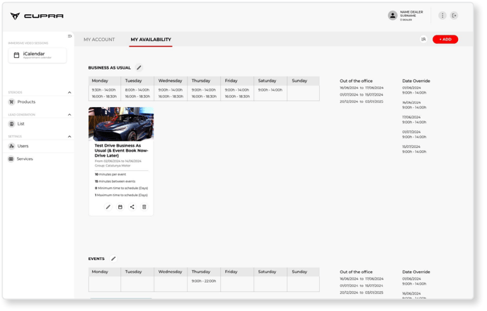 The example screenshot below shows a CUPRA Master with two separate calendars. One refers to parameters and working hours defined as “Business as usual” with daily availability from 09:30 to 14:00 and from 16:00 to 18:30. The services of “1. TD Book Now, Test Later (public landing pages and event URL)” and “2. TD Book Now, Drive Now (event)” are associated with this availability. The second calendar is defined as “Events” with availability on Thursday from 09:00 to 22:00 and the service of “2. TD Book Now, Drive Now (event)”.