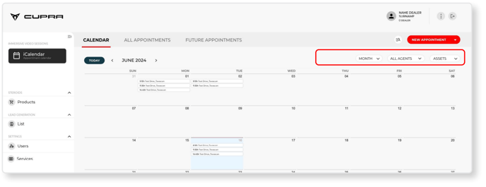 The Calendar tab provides access for the CUPRA Master to a series of filters for displaying the bookings that meet certain selection criteria: Month, Agent, Group.