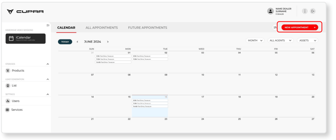 To enter a test drive booking from the iCalendar section, click on the red “New appointment” button in the top-right of this tab.