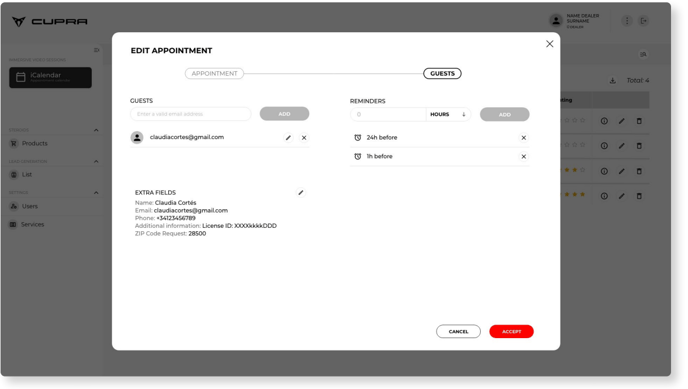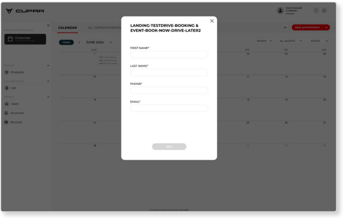CUPRA Masters will not only be able to view the bookings made by users via the test drive landing pages. CUPRA Masters will also be able to manually create appointments/bookings from the calendar in the event that, for example, the dealership receives a request from a customer by telephone or in person.