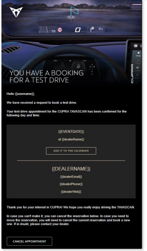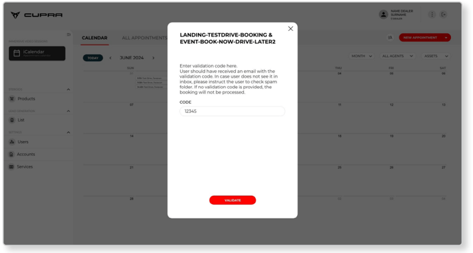 The next step will send an e-mail to the user with a validation/booking code, which they will need to tell the CUPRA Master so the appointment booking can be finalised.