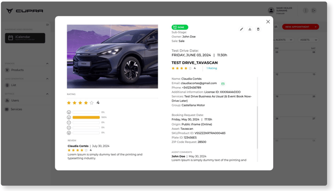 When clicking on any appointment/booking in the calendar, a pop-up window will open containing all the information gathered for that session. It will be possible to edit the file from here to include any necessary post-booking or post-test drive information.