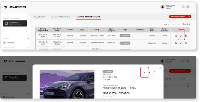 CUPRA Masters can edit test drive booking appointments by clicking on any appointment in their calendars or clicking the pencil icon edit button in the “All appointments” or “Future appointments” tabs. To do this, simply click on the button marked with the pencil icon.