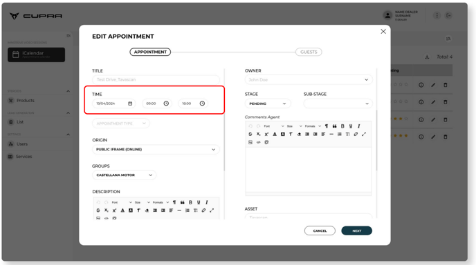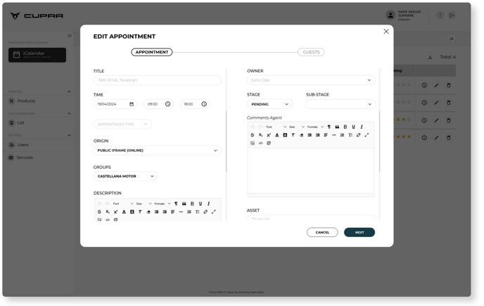 To edit the time or date for a scheduled session, the CUPRA Master should open the booking and change it from the edit panel or from the calendar by clicking on the appointment in question.