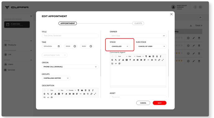 The CUPRA Master must also select a “Sub-status” and enter more details about the reason for cancellation in “Comments from the agent”.