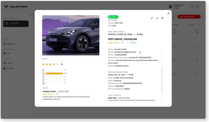 Clicking on the information icon (i) will open a pop-up window with all the information about the test drive booking and the end user with which that session has been scheduled.