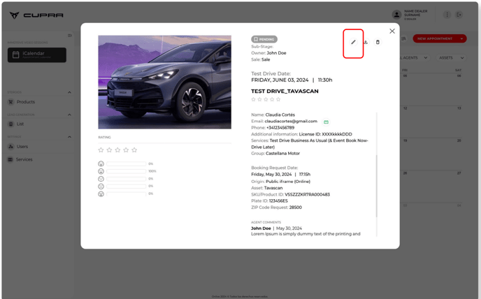 CUPRA Masters can edit any of the information related to a session by clicking on the “Edit” icon in the top-right of the pop-up window, except for the comments and rating from the end user.