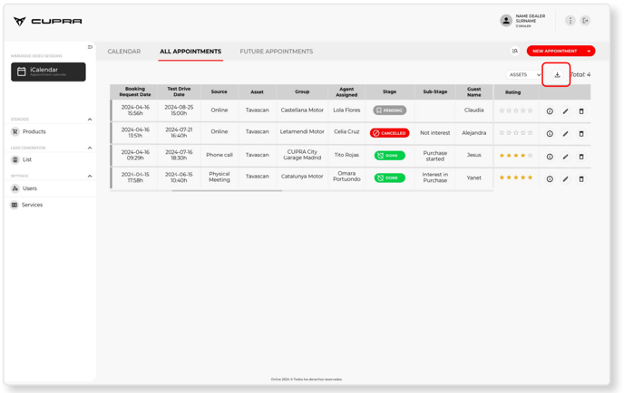 The market admin (importer) can filter the information by group or agent (dealership or CUPRA Master).