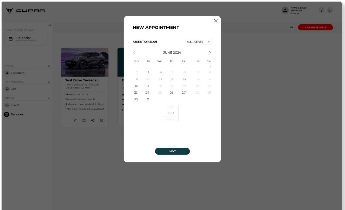 2. Select the date and time that the user wants from the available options. If there are more than one CUPRA Masters in a group/dealership, you will need to select the calendar for the specific agent to whom the booking will be assigned.