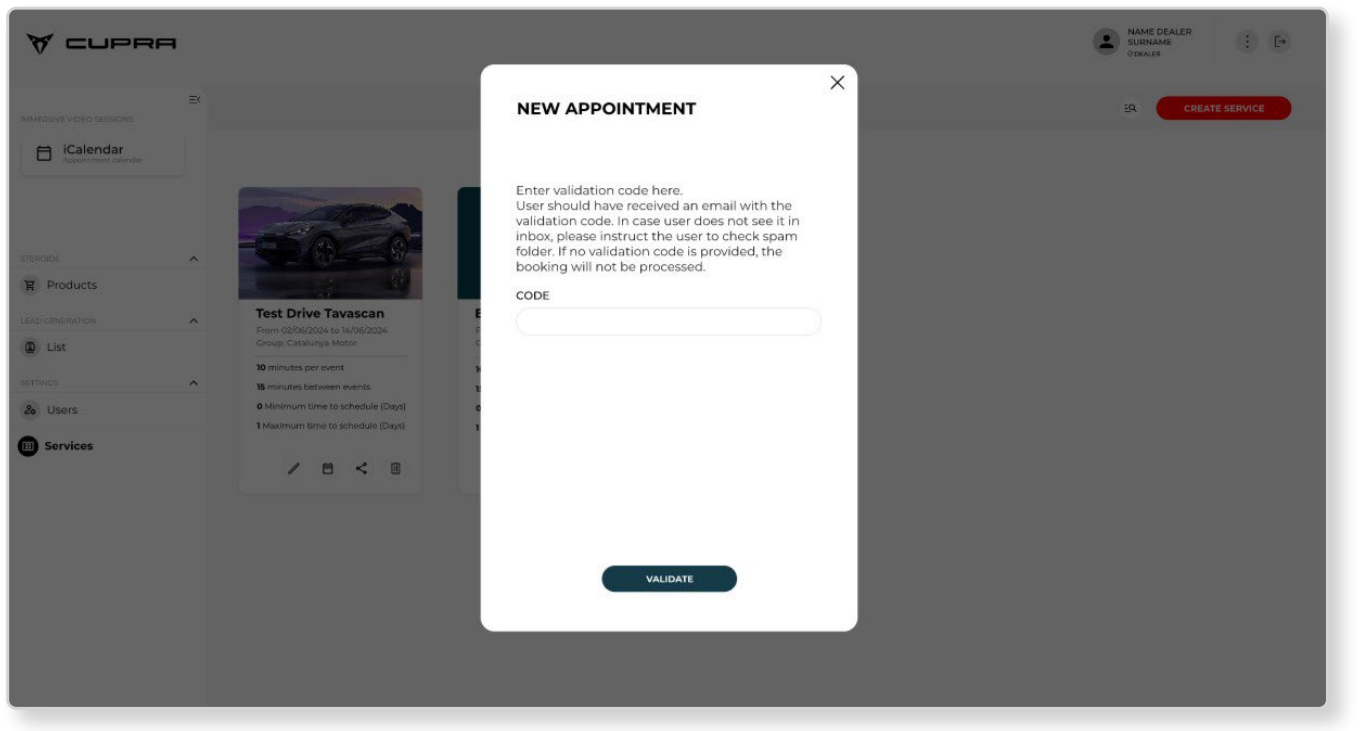 4. The next step will send an e-mail to the address provided by the end user with a validation code, which they will need to tell the agent so the test drive booking process can be finalised.