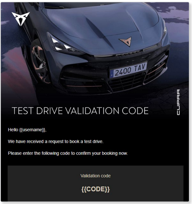 - Note: The booking cannot be completed without this code. Within this e-mail, part of the T&C for the test drives get accepted by the user. Therefor, it is very important that the user uses their own e-mail and accepts these conditions by providing the validation code.