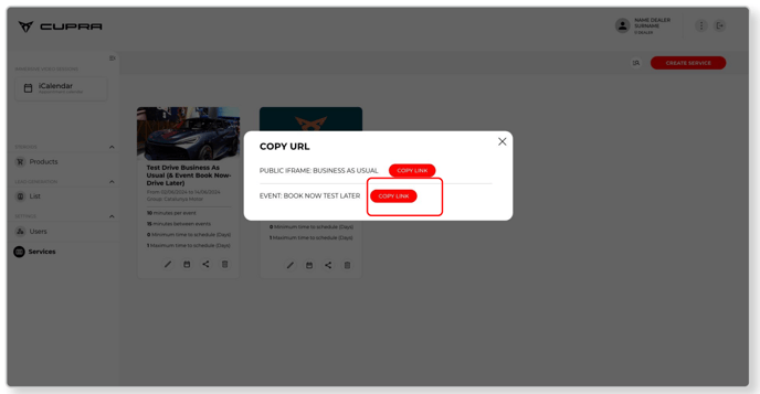 The CUPRA Master or importer must then copy the URL for the Service Type “Service: “2. Book Now, Drive Now TD (event)”.