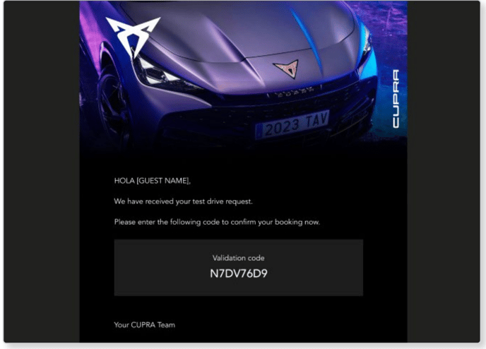 In this case, the user will also receive an e-mail with the validation/booking code that they will need to share with the CUPRA Master processing the booking in order to finalise the process. It will not be possible to finalise the booking without that validation/confirmation code.
