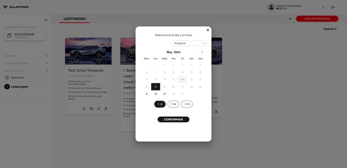 2. Das Datum und die Uhrzeit auswählen, für die der Benutzer die Verfügbarkeit wünscht. Falls es mehr als einen CUPRA Master in einer Gruppe/bei einem Händler gibt, muss die Agenda des entsprechenden Agenten ausgewählt werden, dem diese Buchung zugewiesen wird.