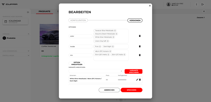 Unter der Registerkarte „Varianten“ werden die Konfigurationsoptionen angezeigt, mit denen das Fahrzeug im System registriert ist – etwa Motorisierung, Schaltung, Farbe, Ausstattungslinien etc.