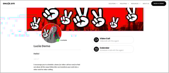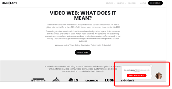 - One-to-one Widget: Puede tener un botón en su sitio web donde los usuarios puedan solicitar una videollamada instantánea, programar una videollamada para el futuro o escribir sus preguntas para que un agente pueda ayudarles. (Ejemplo)