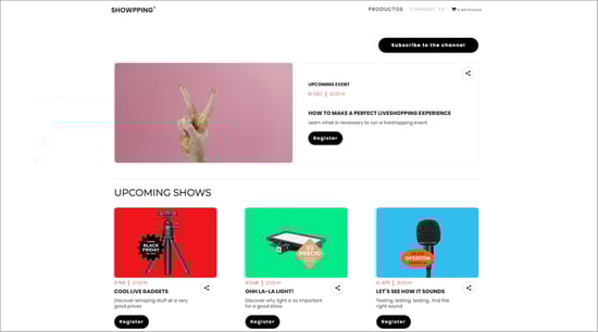 - Canal de TV *: Un widget personalizable para integrar en su sitio web donde podrá mostrar todos sus eventos y vídeos shoppable.