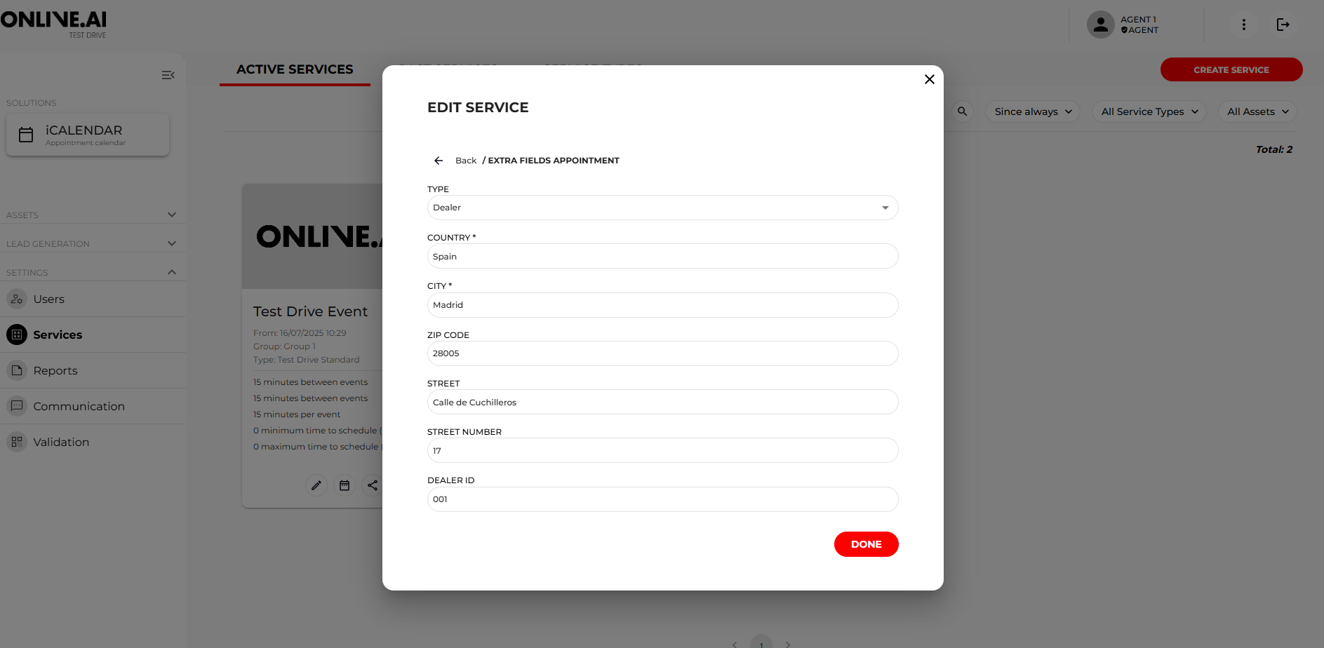 Each service template sends its automated notifications to users who have made test drive bookings. The dealer can change the contact details (email, address, phone) that appear in the automatic notifications of a service.